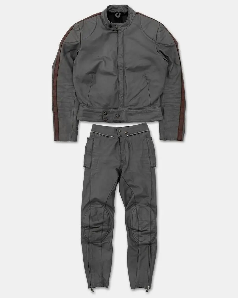 LEDER ROTH 1980S RACING LEATHER JACKET AND LEATHER PANTS SET GREY PURPLE